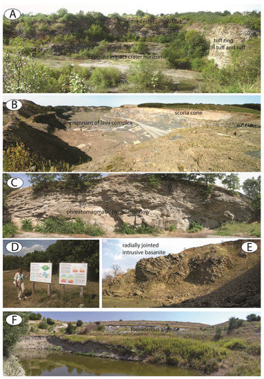 - Nemeth, K.; Goth, K.; Martin, U.; Csillag, G.; Suhr, P. Reconstructing paleoenvironment, eruption mechanism and paleomorphology of the Pliocene Pula maar, (Hungary). J. Volcanol. Geotherm. Res. 2008, 177, 441–456. [Google Scholar] [CrossRef]