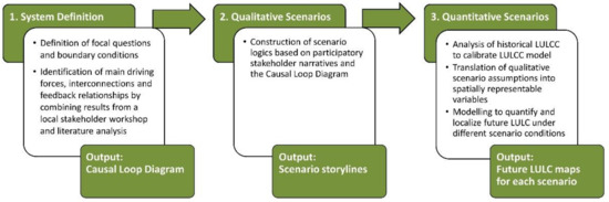 Anthropogenic land use and land cover change (LULCC) is a fundamental component of global change [1]. Primarily driven by the accelerating societal demand for ecosystem goods and services, more than 50% of the terrestrial surfaces are already anthropogenically transformed [2]. This has profound implications on the climate [3], soils [4], water resources [5] as well as biodiversity and ecosystems [6]. On the one hand, the production of food and the use of natural resources are fundamental to human development and the achievement of the Sustainable Development Goals (SDGs). On the other hand, the ongoing conversion and degradation of natural vegetation are at risk to ultimately erode the ability of the biosphere to permanently provide ecosystem goods and services, thus risking the long-term sustainability of human livelihoods and well-being [7]. The assessment of potential future LULCC and its underlying dynamics is therefore crucial for ensuring sustainable land management, development strategies, and conservation measures [8]. LULCC arises from dynamic and multi-scalar interactions of biophysical, socio-economic, and political systems [9]. Scenario analysis is widely applied to investigate possible future pathways of such coupled socio-ecologic systems [9,10,11]. Rather than giving accurate forecasts or predictions, the objective of scenario approaches is to investigate a variety of alternative future trajectories based on coherent and internally consistent assumptions about the development of key driving forces [8,10]. Diverse approaches, frameworks, and methods for scenario analysis exist [10,12,13,14]. Commonly, a distinction is made between qualitative scenarios expressed in narrative storylines and quantitative scenarios usually based on numerical computer models. Qualitative LULCC scenarios provide the benefit that they enable the investigation of complex interrelationships and interdependencies [13,15]. Moreover, qualitative scenarios easily facilitate the communication between scientists, decision-makers, and the public both during the scenario development process and in the presentation of results [15]. Participatory scenario building is increasingly applied since the inclusion of different perspectives and insider knowledge considerably enhances the relevance and legitimacy of scenarios [8,12,15]. At the same time, however, qualitative scenarios are criticized firstly for their difficult reproducibility and secondly for their lack of numerical information, which is considered to prevent further scientific and decision-making processes [12,15]. These criteria are in turn met by quantitative scenarios. Quantitative LULCC scenarios examine potential futures through numerical simulations of the rates, types, and tempo-spatial allocations of land use/land cover (LULC) related to the investigated development paths. The comprehensive modeling process produces detailed and reproducible numerical information, but risks the exclusion of stakeholder knowledge and the loss of communicability [9,13]. Therefore, a combination of both well-elaborated and described qualitative scenarios and quantitative scenarios is well recognized as it makes studies more holistic and robust: The contextualization and inclusiveness of a quantitative scenario can be enriched through qualitative information while a qualitative scenario can become more plausible and meaningful through substantiation with quantitative information [10,13,14,15,16]. Yet, the integration of both qualitative and quantitative scenarios poses a methodological challenge which Alcamo (2008) [15] denotes the reproducibility problem and the conversion problem. The reproducibility problem relates to the fact that the assumptions and logics behind the qualitative scenario storylines are often based on specific participatory processes and therefore difficult to replicate. The conversion problem arises because scenario storylines cannot be directly transformed into numerical model inputs. In order to improve scientific credibility, the transformation process of the underlying assumptions and scenario logics therefore requires a transparent translation process [10,11,13].