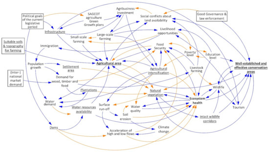 However, isolated analysis of this feedback loop may be misleading since other interlinkages also influence the variables concerned. The negative feedback loop B1 has a balancing effect on the situation, for instance. The more well-established and effective conservation areas there are, the less land is available for agriculture. Moreover, relocating farmers from their already existing fields may be necessary in the course of enforcing protected areas. The literature review revealed that several studies report on evictions and resettlements of the inhabitants in order to create protected areas [29,73,74]. As a consequence, the population is required to cultivate new areas for their livelihoods, leading to an expansion of agricultural land outside protected areas. This further depletes natural vegetation, which has a balancing effect on feedback loop R3. Additionally, the concerned feedback loops are also interconnected with the feedback loops R1 and R2 described above via the factors agricultural area, natural vegetation, and ecosystem health. The two loops, R3 and B1, highlight the fact that feedback loops are not isolated sub-systems but rather influenced by the other factors interlinked within the CLD. Measures such as nature conservation, which have a positive impact on the environment in one place, can lead to negative repercussions elsewhere. Spatial analysis can clarify these interrelationships.
