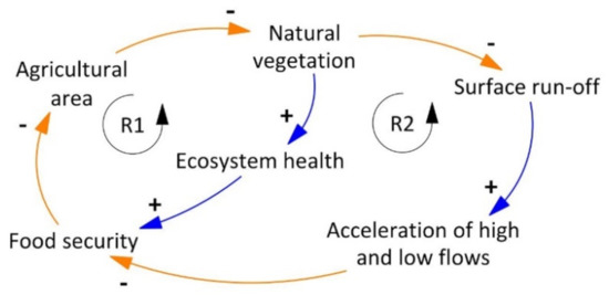 Starting from the agricultural area, an increase in cultivated land leads to a decrease in natural vegetation. A decline in natural vegetation affects ecosystem health negatively. The worse the condition of ecosystem health, the less food security prevails. The lower food security, the higher the need to further expand agricultural areas whereby the loop closes (R1). In the long term, this leads to a self-reinforcing deterioration of the situation. The second feedback loop (R2) constitutes an extension of the first feedback loop: The more agricultural area increases, the less natural vegetation is left and the more surface run-off is generated. This in turn results in an acceleration of high and low flows. The longer and more intense high and low flows occur, the further food security is jeopardized. Hence, more agricultural areas are cultivated. The two feedback loops reinforce LULCC through an expansion of agricultural areas at the expense of natural vegetation. This leads to continuing environmental degradation and food insecurity. The references for the drawn connections within the feedback loops are provided in Table 3.