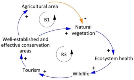 The more well-established and effective conservation areas there are, the more natural vegetation is resulting in an increase in ecosystem health. The more ecosystem health, the more wildlife exists. The more wildlife is to watch, the more tourists are attracted. The more tourism generates income through park fees, the more money is available for perpetuating well-established and effective conservation areas. Hence, nature conservation efforts benefit the environment and can be continued through tourism (R3). On the contrary, if the situation is the reverse and protected areas are less well-established and effective, this can have negative consequences for both the environment and tourism, leading to a downward spiral.
