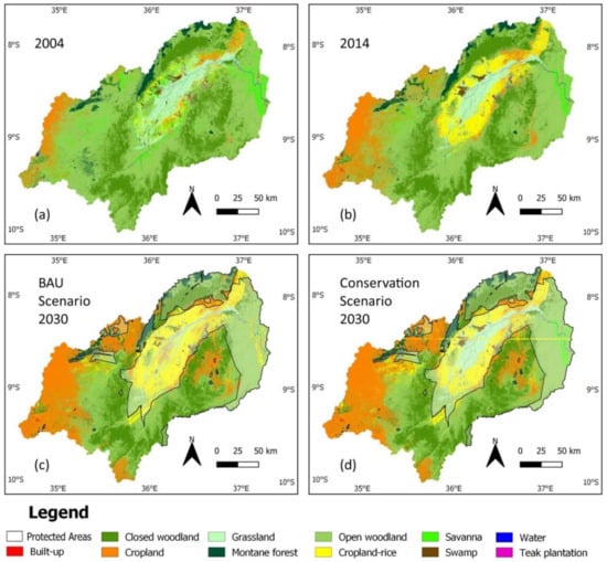 Figure 6c,d presents the results of the LCM for the 2030 scenarios. To reveal projected LULCC within protected areas, their extent is overlain with a semi-transparent layer. The LULC maps of 2004 and 2014 are also portrayed to give a historic context (Figure 6a,b).