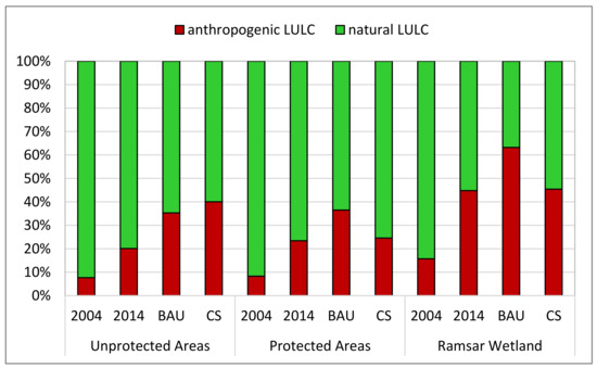 The impact of LULCC on the condition of the ecosystem, biodiversity, or ecosystem services is largely determined by both the intensity of change and the resulting LULCC [18]. While changes within natural LULC classes such as transformations from closed to open woodland may have inferior impacts, conversions from natural land covers to anthropogenic land uses normally have pronounced effects. Figure 7 compares the proportion of anthropogenic and natural LULC in the different scenarios within protected areas, outside protected areas, and in wildlife corridors. Anthropogenic LULC comprises the LULC classes cropland, rice, plantations, and built-up. Montane forest, swamp, water, grassland, savanna, open woodland, and closed woodland were combined and placed in the natural LULC category.