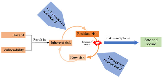 According to the aforementioned idea of overall risk management, the risk can be divided into inherent risk, residual risk, and new risk. The logical relationship between risk and risk management capacity is shown in Figure 1. In a certain round of risk evolution, the inherent risk is determined by the hazard and vulnerability. The risk that still exists after the implementation of risk prevention and control measures is called residual risk, which needs to be controlled by continuous and effective emergency management measures. Once the emergency situation is lifted, risk will enter a new round of the evolution stage.
