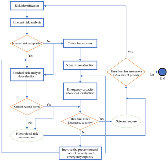 Urban safety and security assessment is cyclical work. Following the concept of “overall screening, key analysis, comprehensive evaluation”, we have established an assessment process for a single urban safety and security assessment, as shown in Figure 3. It divides urban safety and security assessment into three stages: risk assessment, emergency capacity assessment, and urban safety and security assessment. The first two are the basis of urban safety and security assessment, while inherent risk analysis in risk assessment is the premise of emergency capacity assessment.