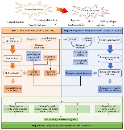 The stage of urban safety and security assessment of the whole area, which integrates various critical hazard events, follows two steps. First, by comparing the gap between residual risks and emergency capacities, the urban safety and security grade under the influence of a specific critical hazard event is evaluated. Second, the urban safety and security grades during various critical hazard events are synthesized to evaluate the overall safety and security grade of the urban area.