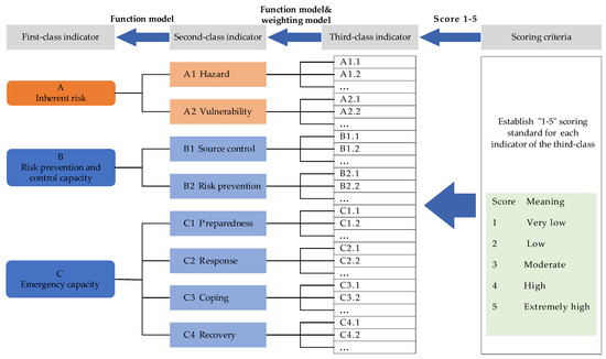 As shown in Figure 3, the grade of urban safety and security is obtained by integrating the residual risk grade and emergency capacity grade of all critical hazard events. Residual risks are calculated by combining inherent risks and risk prevention and control capacity. Therefore, taking inherent risks, risk prevention and control capacity, and emergency capacity as the first-class indicators, the framework of the assessment methodology proposed in this paper is shown in Figure 4. First, we construct a three-class indicator system composed of (1) inherent risk, (2) prevention and control capacity, and (3) emergency capacity, as well as their characteristic elements, and establish “1–5” scoring criteria for each third-class indicator. Second, we aggregate the third-class indicator scoring values to form the second-class indicators evaluation value by a weighting model or a function model. Finally, we calculate the evaluation value of the first-class indicators with the second-class indicators evaluation value by the function model.