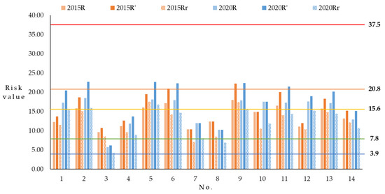 The results of the risk assessment of 2015 and 2020 are shown in Figure 6. It can be found that: