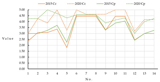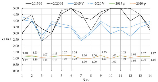 Table 7 summarizes the results of the urban safety and security assessment of Area A in 2015 and 2020, as can be seen from Table 7: