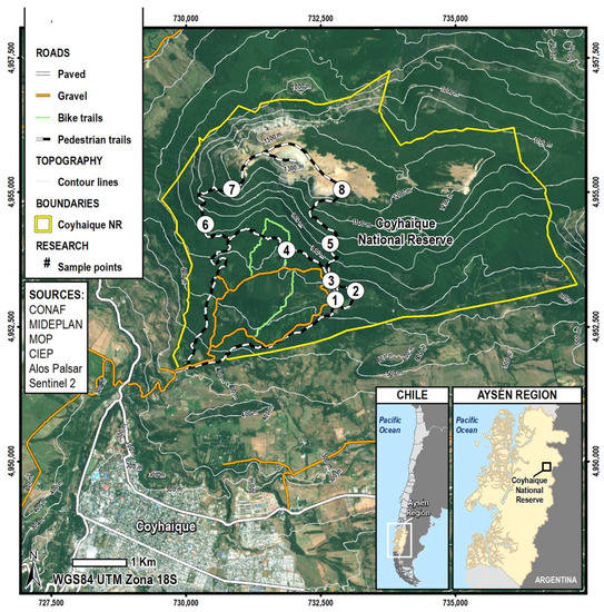 Map of the Coyhaique National Reserve and the 8 sample sites.