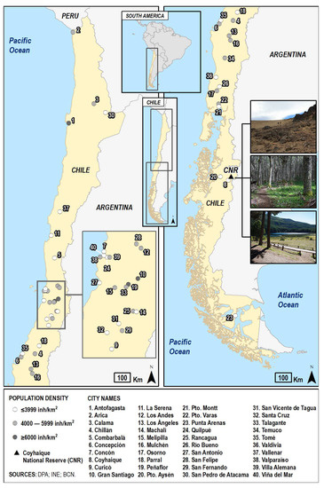 - Chilean National Institute of Statistics (INE). Entrega Resultados Definitivos Censo 2017; Chilean National Institute of Statistics (INE): Santiago, Chile, 2018; p. 10171. [Google Scholar]