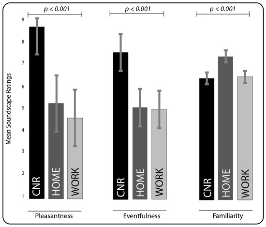 Significant differences were found for all three PAQ components (pleasantness, eventfulness, and familiarity) between the CNR, home, and work contexts (Table 2). Among these, pleasantness had the largest effect size (η2 = 0.57). Post-hoc pairwise comparisons indicated that both pleasantness and eventfulness were rated significantly higher in the CNR than in either the home or work contexts (p < 0.001), which did not significantly differ. Familiarity, in contrast, was rated significantly higher at home than in the work or CNR contexts (p < 0.001), which did not differ. Overall, the mean pleasantness rating for the CNR was the highest of all the pleasantness, eventfulness, and familiarity ratings across the three contexts (home, work, and the CNR), followed by eventfulness for the CNR, and then familiarity for home (Figure 4). In contrast, the mean work pleasantness rating was the lowest of all the soundscape ratings.
