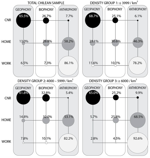 Figure 5 shows the proportion of prevalent sound themes perceived within the CNR, home, and work environments by participants who reside within different UDs. While there was no consistent trend in the prevalence of geophonic sound perceptions in the CNR based on residence density, there were clear trends of decreasing geophonic sounds in both home contexts (23.1%, 14.8%, and 5.7%, respectively) and work contexts (11.6%, 7.8%, and 2.8%, respectively). Considering biophonic sounds within the CNR, DGs 1 and 3 reported similar prevalence (25.1% and 25.2%, respectively), and DG2 reported a larger amount (32.0%). Biophonic sounds for the home context appeared to be somewhat less prevalent in DG3 as compared with the other groups (30.6%, 32.0%, and 25.8% for DGs 1, 2, and 3, respectively). There were also fewer reports of biophonic sounds in work contexts for DG3 (4.5% compared to 10.1% for DGs 1 and 2). Anthrophonic sounds for both home and work settings increased in prevalence as city density increased from lowest to highest density (home: 46.3%, 53.1%, 68.5%; work: 78.2%, 82.2%, 92.6%).