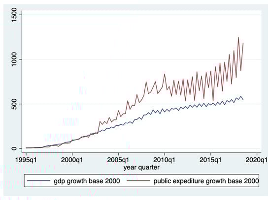 The purpose of our study is to identify the nature of the link between government expenditure (exgov) and economic growth (gdp) in order to test the two theories belonging to Wagner and Keynes, for the case of Romania (see Figure 1). To achieve this objective, we used half-yearly data, for the period 1995–2018. For government expenditures (exgov), we used the collective final consumption expenditure of the general government (adjusted series) and price indices in % against 2000. The seasonally adjusted series was obtained by removing this effect from the unadjusted series, by means of correction coefficients, selected according to the regression model that was used—additive or multiplicative [62]. For the Gross Domestic Product series (gdp), we used quarterly gross domestic product—seasonally adjusted series, price indices in % against 2000. The seasonally adjusted GDP is obtained through the direct method, thus leading to a statistical discrepancy between the GDP and the sum of its components, which are independently and seasonally adjusted [63].