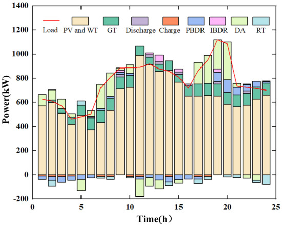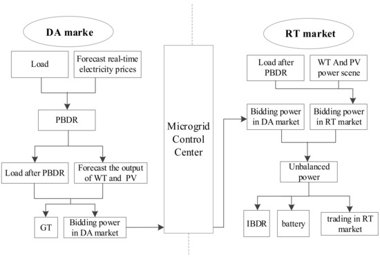 In the day-ahead market, microgrid operators take the typical daily load curve as the actual load curve, determine and notify the user of the hourly electricity price of the next day in advance, implement the PBDR to shift peak load, and obtain new load curves. Based on the load after the implementation of the PBDR and the predicted wind and PV power, the microgrid operators call gas turbines to balance the deviation and determine the amount of bidding electrical power in the day-ahead market and its decision-making results can be used in the real-time market.