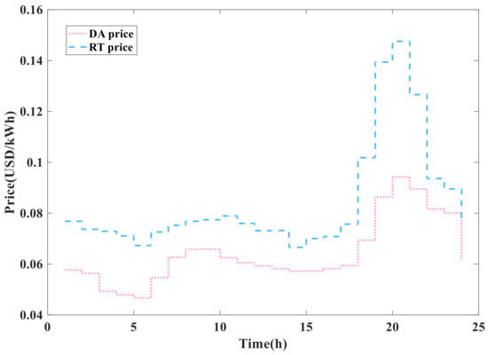 The spot electricity market is also referenced as short-term electricity market. Generally, the spot market is divided into the day-ahead market and the real-time market according to time scale. In the Nordic electricity market, there is also an intraday market between the day-ahead market and the real-time market. Due to the small trading scale of intraday market in the entire spot market, it is often ignored [31]. This paper considers day-ahead market and real-time market and proposes an energy management strategy suitable for microgrids with a high renewable energy penetration rate so as to maximize the expected revenue of the microgrids.