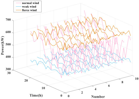 In Equation (6), is the output power of the wind turbine in period , kW, is the rated power of the wind turbine, kW, and , , and are the cut in wind speed, cut out wind speed, and rated wind speed of the wind turbine in m/s, respectively.