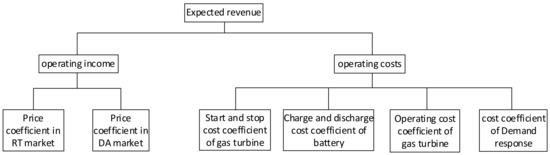 where is the income of microgrid selling electricity to users, and are the income of the microgrid in the day-ahead market and real-time markets in USD, respectively. represents the cost of the gas turbine, is the charge and discharge cost of the battery storage, and represents the demand response cost in USD.
