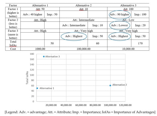 The deployment of the CBA is carried out in seven steps briefly described below. The product of the CBA tool is a table and a graph, as depicted in Figure 1. This is a generic figure showing an example of a table resulting from the CBA deployment. The CBA table, as shown in Figure 1, which supports the development of graphic plotting importance versus the cost of alternatives, is used in the decision-making process [35,36,37].
