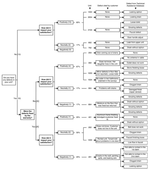 Additionally, it is worth noting that multiple defects in the same unit, recurrent defects, or failure of the TAD to contact the customer to solve the problem have been found to cause a negative impact on customers. Accordingly, this impact is not necessarily caused by the type of defect that the unit has presented, so these cases should be removed from the analysis [7]. Once the TAD and CSS data were pre-processed and cross-checked for reliability, and these types of cases were removed from the database, the next step is determining the impact of the defect on customer satisfaction. Therefore, the number of times each defect was reported in the TAD database for a particular residential unit was accounted with an evaluation label of positive, neutral, or negative impact on their satisfaction.
