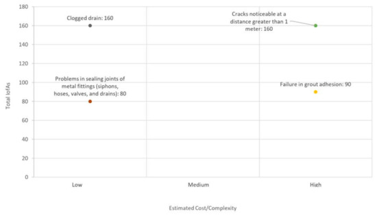 Figure 5 reveals that the group defined “clogged drain” as the most important defect, which should be the focus of the company’s continuous improvement activities. The defect “clogged drain” presented the highest sum of the importance of the advantages, tied with the defect “perceptible cracks at a distance greater than 1m”, but it has a lower estimated cost/complexity for the mitigation activities, and it has a negative impact on the customer satisfaction.