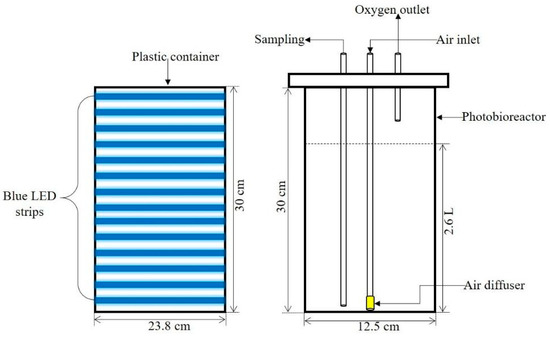 Verrucodesmus verrucosus was grown under three light intensities (1000, 2000 and 3000 Lux) in three different photoperiods (16:08, 12:12 and 24:00) in a bubble column photobioreactor with a volume of 3 L at a temperature of 25 °C. The photobioreactor consisted of a cylindrical glass vessel 30 cm long and 12.5 cm in diameter with an expanded polyurethane cap with three holes for air inlet, sampling and oxygen outlet. The air (with 0.03% CO2) was injected continuously into the culture from the bottom of the container through a plastic diffuser. Strips LEDs SMD5050 blue (465–470 nm) of 12 V and 3 A were used as the light source. The LED strips were placed horizontally (spirally) inside a cylindrical plastic container measuring 30 cm long and 23.8 cm in internal diameter, this container was placed on the photobioreactor and the LED strips were at a distance approximately 5 cm of the culture (Figure 1), also the light intensity was adjusted manually with a voltage regulator LM2596 with display with a power of 15 W, 2 A. The variation of the photoperiod was made using a 24 h analog timer. The light intensity and CO2 were measured with a light and color sensor GDX-LC and sensor CO2 inPro 5500i respectively, connected via USB to a laptop using the Graphical Analysis 4 software (Vernier Software and Technology, Beaverton, OR, USA). Five mL of culture was taken for sampling in a 24 h interval. Each experiment was carried out in triplicate to guarantee the reproducibility of the results (Figure 1).