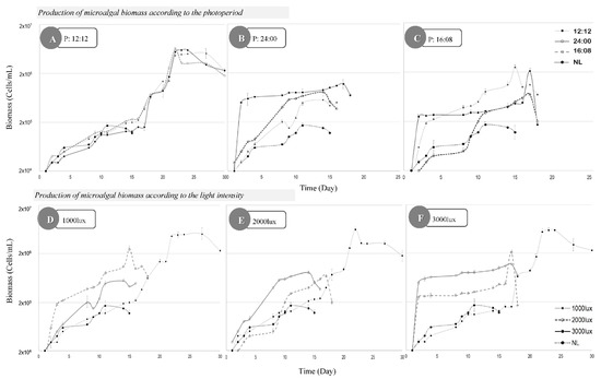 On the other hand, the influence of light/dark cycling on lipid accumulation and biomass production has been characterized in some microalgal species. As demonstrated in this research paper, where the best photoperiod for obtaining lipids was 12:12 (Table 1), these results are similar to those obtained in other research papers where they evaluated Chlorella vulgaris, and higher biomass production and lipid content were achieved under 12 h: 12 h light:dark cycles relative to a 24 h: 0 h continuous illumination condition [28]. In Nannochloropsis sp., lipid content and growth rate were highest under an 18 h:6 h light/dark cycle compared with 24 h:0 h and 12 h:12 h cycles [12,22]. In Nannochloropsis gaditana, biomass concentration was highest under a 12 h:12 h light/dark cycle, while lipid content was highest under a 16 h:8 h cycle, relative to 24 h:0 h and 8 h:16 h cycles [9]. In Tribonema minus, however, biomass production and lipid content were higher under 24 h:0 h continuous illumination compared with that under a more natural 12 h:12 h cycle [29].