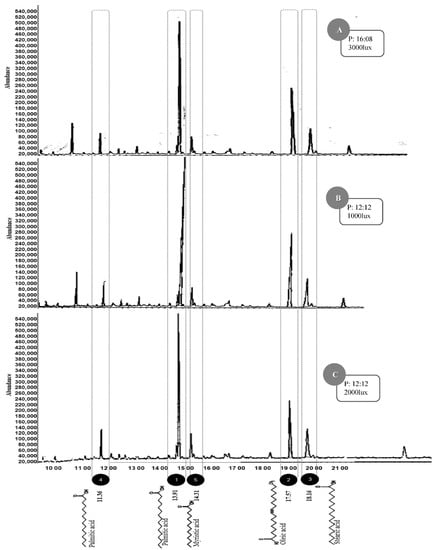 Regarding the chromatographic analysis of the profile of fatty acids present in the lipid samples obtained from the better yields at different light intensities, palmitic acid was observed as the most abundant of 42.03 to 55.21% (Figure 3). Of the identified fatty acids, 64.29% correspond to saturated fatty acids and 35.71% correspond to monounsaturated fatty acids (Table 3).