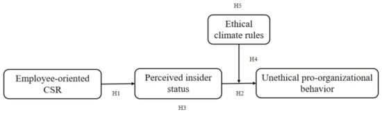 Based on the above discussion, employee-oriented CSR policies promote the direction of valuable resources and emotional belonging through investment and care towards employees, thereby significantly improving employees’ perception of insider status. In turn, the employees with a higher level of insider status perception will actively implement favorable behavior to reward the organization. Even if this behavior is unethical, as long as it is beneficial to the organization, employees are willing to engage in it [43,44]. Therefore, the researchers propose: