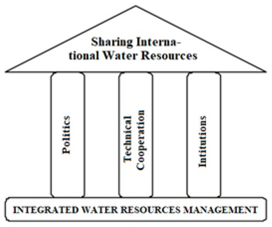 There is growing awareness that comprehensive and integrated water resources management is needed because: freshwater resources are limited; those limited freshwater resources are becoming increasingly polluted; limited freshwater resources have to be divided among the competing needs and demands in society; many citizens do not yet have access to sufficient and safe freshwater resources; techniques used to control water (such as dams and dikes) may often have unintended consequences for the environment; and there is a close relationship between groundwater and surface water, between coastal water and freshwater, etc. [18]. Integrated management of water resources is needed to reach the sustainable management of water resources. Integrated water resources management has been suggested as a strategy to improve water quality and increase water productivity in a river-basin context. Savenije and Van Der Zaag [19] proposed a classical temple for the distribution and management of international water resources (Figure 1). Integrated water resources management is the foundation, and the distribution of water resources is the temple roof in their model. The three pillars represent the necessary elements for sharing and managing international water resources: one political, one technical, and one institutional. The political pillar is required to implement an enabling environment, creating opportunities for international cooperation and planning. The legal, institutional post contains traditional and institutions instruments evolved at the national and international levels. In the frames of this pillar, the critical concern is the establishment of river basin organizations at the policy level and at the implementation level. For instance, a joint water commission may be established as the primary policy body. A river basin authority may be formed with responsibilities to execute, operate, and manage specific issues. Lastly, the technical or operational pillar must be in place, allowing for the broader concepts to be translated into active measures and actions. This pillar is regarded as central for the successful management of international river basins; if one of the outer pillars is weak or damaged, the technical post may bear most of the load.