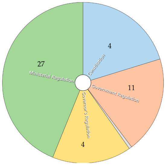 This study uses a qualitative content analysis approach to government regulations directly related to watershed management in Indonesia. Qualitative content analysis is a qualitative research approach used to understand and interpret the text in a document. The purpose of applying a qualitative approach to content analysis in this study is to understand and interpret the text of the laws and regulations governing watershed management in Indonesia. The total regulatory documents analyzed (Figure 3) in this study were 46 regulations concerning the Brantas River, including 4 constitutional documents, 11 government regulations, 27 ministerial decrees, and 4 governor regulations.