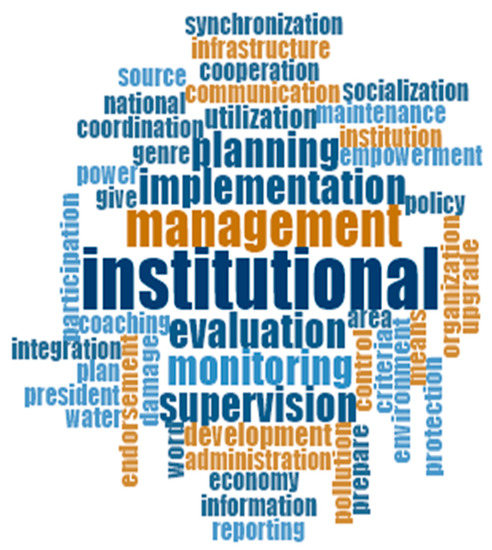 The 2005 World Summit identified three main pillars of sustainability: environmental, economic, and social. Environmental aims to maintain a stable base of resources, preserve ecosystems, and biodiversity; to avoid overexploitation of renewable resources; to safeguard the quality of the atmosphere; to recycle, etc. Economic sustainability focuses on the generation of wealth in the long term, namely producing goods and services, creating jobs and prosperity, pursuing efficiency, etc. The social is concerned with achieving equity; providing social services; guaranteeing social inclusion; preserving cultures, groups, and places; and ensuring political accountability and community participation [35]. The institutional analysis is based on the institutional framework’s chosen definition and is related to three pillars of critical institutional areas: policies, laws, and administration.