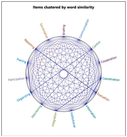 Figure 5 reveals that there is a relationship between aspects of the Brantas river management in Indonesia as indicated by the Pearson correlation coefficient correlation value obtained from the coding results on the regulatory content regarding Brantas river governance. The Pearson correlation coefficient value scale is 0–1, where 0 indicates a weak correlation, while 1 indicates a strong correlation. Planning and organizing regulations have a Pearson correlation coefficient of 0.8, which is the highest correlation value compared to planning correlations with other aspects. This value shows that planning activities are more related to resource organizing activities than participation activities and public coordination, which confirms that the Brantas river management system in Indonesia is more centrally oriented, placing local governments as actors who play a major role in organizing policies rather than formulating, monitoring, and evaluating policies. Policy organization has a strong correlation with supervision, which is 0.8, confirming that policy organization related to the activities of the central government overseeing the implementation of the Brantas river governance policy at the regional level. Reporting has a strong correlation with evaluation, namely 0.7. The strong correlation between reporting activities and evaluation activities confirms that the governance of the Brantas river in Indonesia is focused on the reporting and evaluation stages rather than the planning, direction, and policy dissemination stages.