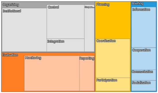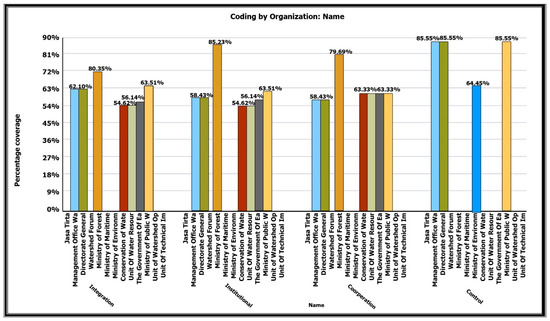 The coding of various watershed management regulations in Indonesia through NVIVO 12 Plus aims to reveal Indonesia’s watershed management priorities. The coding and analysis of watershed management priorities are carried out at various Indonesian regulation levels, ranging from laws, presidential regulations, presidential decrees, government regulations, ministerial regulations, government regulations, and governor decrees. Based on Figure 6, this analysis reveals that watershed management priorities in Indonesia include planning, organizing, evaluating, and briefing. The planning is carried out thought coordination and participation, and the organizing consists of institutional, control, integration, and cooperation. The evaluation carried out by monitoring and reporting and the briefing are conducted using the method of providing information, cooperation, communication, and socialization.