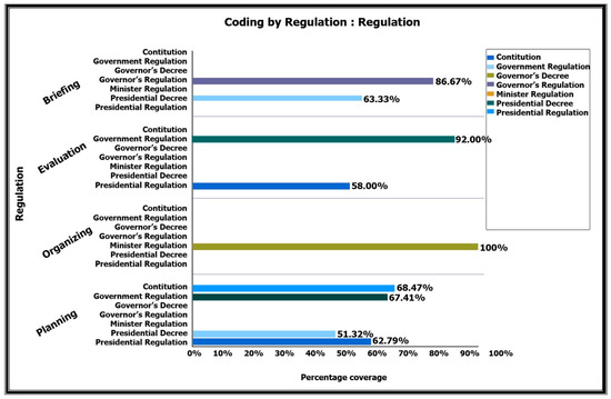 Based on Figure 7, Indonesia’s watershed management planning is contained in laws, presidential regulations, presidential decrees, and government regulations. Many watershed management plans are included in laws (68.47%), followed by government regulations (67.41%), presidential regulations (62%), and presidential decrees (51.32%). Organizing watershed management is concentrated in ministerial regulations (100%). The evaluation of watershed management is contained in two forms of law: government regulations (92%) and presidential regulations (58%). The direction of watershed management is regulated in governor regulations (86.67%) and presidential decrees (63.33%).