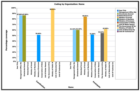 Based on Figure 8, the most coordinated planning for watershed management involves the ministry of a public works housing profile (99.51%), followed by the management office watershed (97%), the general directorate (97%), and the ministry of environment (50.49%). The ministry of forest is the most participating institution in watershed management planning (84.01%), followed by the ministry of a public watershed (62.99%), the management office watershed (61.43%), the general directorate (61.43%), the Government of East Java (53.02%), and the ministry of environment (51.64%).