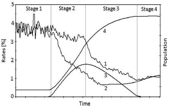 Demographic transitions have leveraged (and are in turn influenced by) socioeconomic changes impacting settlement dynamics and stimulating a complete spatial restructuring of countries and regions, especially in advanced economies [1,2,3,4]. Unprecedented rates of natural population increase, large migratory flows from rural to urban areas, and intense transformation of previously rural locations to metropolitan status, are considered immediate sources of population growth [5,6,7]. Urbanization and demographic transitions reveal how population concentration affects fertility and mortality rates via agglomeration economies and congestion diseconomies [8]. These dynamics determined sequential rises and declines in population growth rates reflected in an inverted U-shaped pattern over time, typical of a demographic process known as the first transition [9]. The ‘demographic transition’ theory was proposed to explain the historical shift from high birth rates and high infant death rates in developing societies, to low birth rates and low death rates in advanced economies, delineating four stages (numbered from 1 to 4 in Figure 1) with distinctive demographic attributes moving from the first to the last scenario mentioned above. While occurring (more or less synchronically) in almost all industrialized countries, specific social, political, and economic factors affecting particular populations have influenced this demographic shift, resulting in strictly homogeneous dynamics only in some cases [10,11].