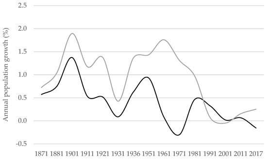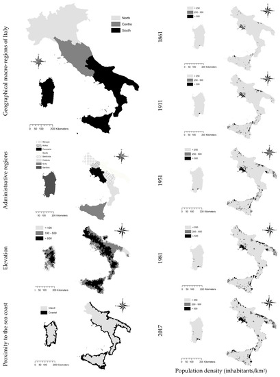 More specifically, we assumed that the spatial distribution of population in Southern Europe has mainly reflected a typical urban–rural divide with accelerated growth of metropolitan areas typical of the late phase of the first demographic transition [27,35,36]. The second transition has represented a much more heterogeneous regime progressively decoupled from traditional geographical gradients [37,38,39]. A comprehensive analysis of population growth rates at the municipal scale from time series (1861–2017) census data was developed with the aim at testing this hypothesis, in turn controlling for population density, past demographic dynamics, and basic territorial characteristics. The role of specific geographical gradients shaping population dynamics was finally investigated adopting a mixed statistical framework that integrates descriptive statistics, inferential techniques, multivariate analysis, and spatial correlation.