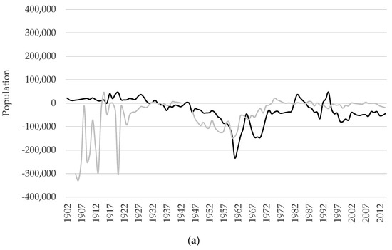 Population increased in lowlands and coastal uplands and declined in internal uplands and mountain districts. The percent share of resident population in lowland districts in total population was 22% in 1861, doubling in 2017 (40%). Coastal uplands maintained a relatively high share of resident population, increasing from 26% in 1861 to 30% in 2017. Population in mountainous districts close to the sea was relatively stable to 3–4% along the entire study period. The largest decreases were observed in internal districts, both uplands (from 28% to 19%) and mountains (from 20% to 8%). Spatially imbalanced population growth—especially during the period 1951–1981—consolidated the demographic divide between coastal and inland areas. High fertility, a progressive reduction of mortality and, more recently, international migration were the main factors boosting population growth in Southern Italy. Emigration rates were particularly high up to the mid-1930s and decreased between the late 1940s and the early 1970s (Figure 3). At the same time, internal migration to Northern Italy was particularly intense between the late 1940s and the mid-1970s, leading to a slightly negative internal balance.