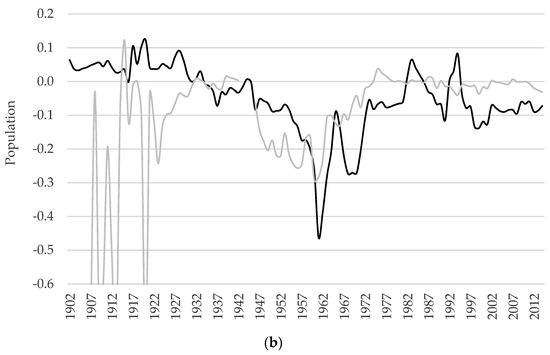 Starting with the unification of Southern Italy within the Kingdom of Italy and ending before World War I, the first stage identified in our study was characterized by a spatially homogeneous growth of population, with higher rates in urban districts than in rural areas. The second stage encompassed the time interval between the two world wars, and featured accelerated population growth in inland flat areas, coastal districts, and urban settlements, and moderate depopulation of the Apennine mountainous region. The third stage extended over the first three decades after World War II, evidencing accelerated demographic dynamics typical of the ‘baby boom’ (1945–1975), intense migration to Northern Italy, and population aging in rural contexts. This stage also reflected a marked polarization of resident population along urban-rural gradients, with intense depopulation of marginal districts, and intense expansion of metropolitan agglomerations. The fourth stage encompassed the last four decades, from the lowest-low fertility of the 1980s to a moderate—while temporary—recovery in the 2000s [46]. During this period, depopulation continued uninterrupted in hyper-rural areas and was associated with a moderate growth of population in peri-urban districts and coastal lowlands [30].