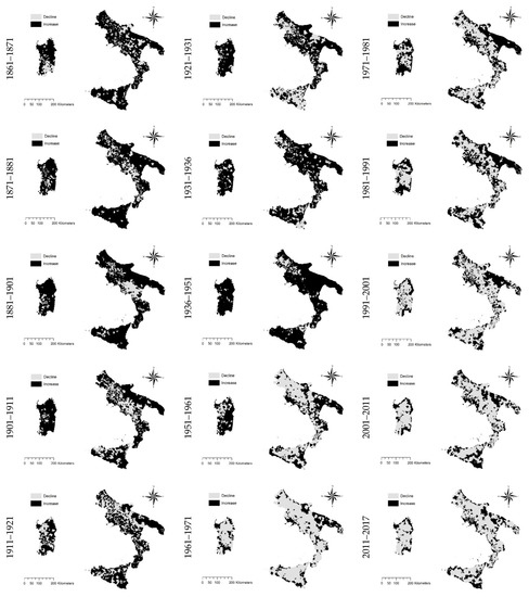 To assess the multivariate relationship between the annual rate of population growth (taken as the dependent variable) and the local context (nine predictors illustrated in Section 2.2 that include population density), a multiple regression approach was run at the spatial scale of municipalities, separately for each time interval between 1861–1871 and 2011–2017. Contextual indicators were included in each model based on a forward stepwise strategy under a significant Fisher–Snedecor F test at p < 0.01 [45]. Results include slope coefficient estimates and the associated significance level (testing for the null-hypothesis of non-significant regression coefficients) based on Student t statistics at p < 0.05. The goodness-of-fit of each regression model was measured using adjusted R2 and tested for significance (against the null hypothesis of non-significant models) through a Fisher–Snedecor F test with p < 0.001. All variables were standardized prior to analysis [33].
