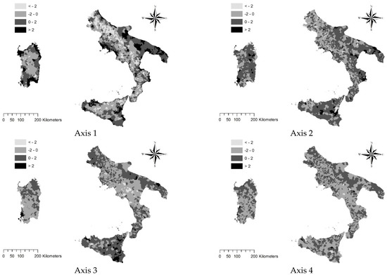 Four components were selected, explaining 51% of the total matrix variance (Table 2). These components identify distinct spatial processes with specific demographic characteristics and peculiar growth rates. Component 1 assigned positive loadings to all time intervals since 1936, with the highest value observed for the decade 1971–1981. The spatial distribution of positive scores on Component 1 identifies areas with the highest population density in Apulia, Campania, coastal Sicily, and Sardinia and, more generally, in flat, accessible districts around the largest cities (Naples, Bari, Palermo, Catania, Cagliari). Conversely, negative scores characterized inland areas along Apennines and in upland Sardinia and Sicily. These areas had the lowest population density in Southern Italy (Figure 6).