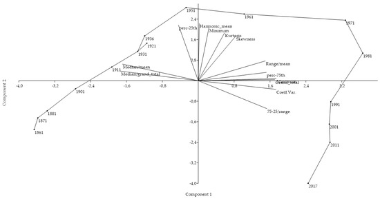 A Principal Component Analysis run to investigate latent patterns of population concentration in Southern Italy highlights three distinct demographic stages (Figure 8). The biplot drawn on Component 1 (56.7% of explained variance) and Component 2 (31.2% of explained variance) indicates a homogeneous stage of growth between 1861 and 1951, associated with a high value of the median-to-arithmetic mean ratio in population density. A second stage, mostly oriented along Component 1 and associated with high values of both skewness and kurtosis in the statistical distribution of population density, was observed between 1951 and 1971. A third stage, oriented primarily along Component 2 and persistently associated with all the indexes of statistical variability, encompassed a relatively long time interval between 1971 and 2017.