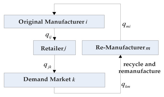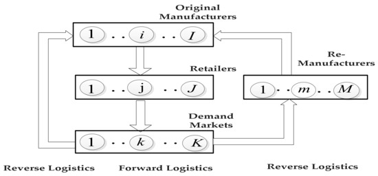 Consider a CLSC network that consists of original manufacturers, retailers, demand markets, and outsourced remanufacturers (referred to as remanufacturers). The situation is depicted in Figure 1. In Figure 1, multiple nodes in the top-level (respectively, the second level) of the forward logistic represent non-cooperation competitions between different original manufacturers (respectively, different retailers), whereas multiple nodes in the reverse logistic represent non-cooperation competitions between different remanufacturers. These mutual competitions constitute non-cooperative games. The links between different layers in the forward logistics (respectively, the reverse logistics) represent product transactions between original manufacturers and retailers and between retailers and demand markets (respectively, between original manufacturers and remanufacturers and between remanufacturers and demand markets). New products produced by the original manufacturers are sold to customers in the demand market through retailers, and these products become used products after they have been used by customers.