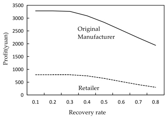 - The profit of manufacturer 2 who chooses the outsourcing remanufacturing policy decreases when compared with the profit of manufacturer 1 who chooses the self-remanufacturing policy.
