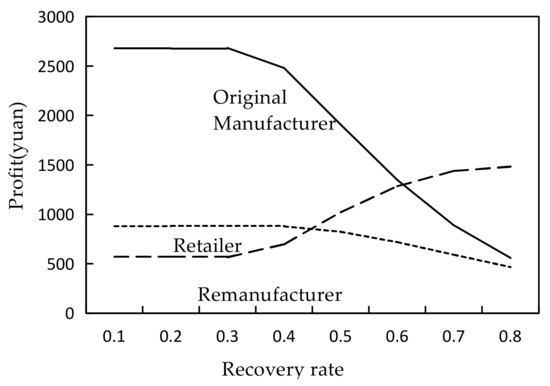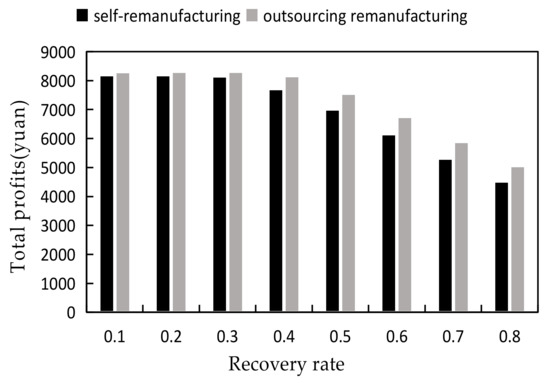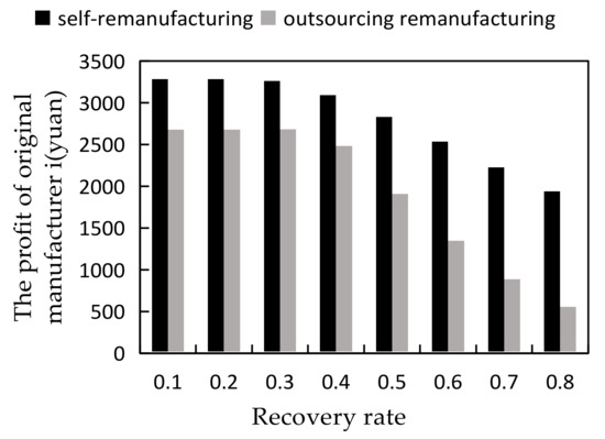 - When the recovery rate of used products is low, the original manufacturers who choose the outsourcing remanufacturing policy can increase sales of new products and recycling of used products. When the recovery rate is high, the original manufacturers who choose the self-remanufacturing policy can gain more profits.