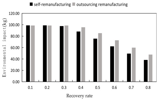 From Table 7, it can be seen that when the environmental impact parameter of the new products increases, the environmental impacts of both the self-manufactured policy and the outsourcing remanufactured policy also increase; however, the environmental impact of the outsourcing remanufactured policy is smaller than that of the self-remanufactured policy.