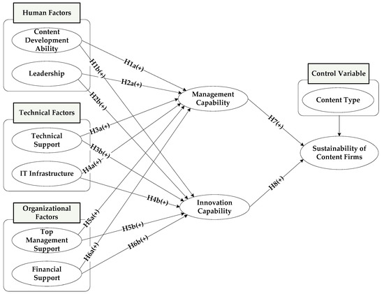 Although there are ongoing technical and explanatory discussions on digital content, few studies focus on corporate competency related to strategy. Therefore, this study empirically verifies the factors affecting competence in terms of business management and innovation capabilities for the sustainable growth of content companies [8,9]. From this point of view, we used a psycho-socio-technical process embedded within an organizational structure by Damaševičius [10], which is proposed as an approach that must be considered in leading organizational success through the development and analysis of existing software and strengthening the organization’s information technology capabilities. Based on this, human, technical, and organizational factors were proposed as important factors in enhancing the competency of content companies. Since the organizational competency of a content company does not consist of specific elements inside and outside the organization, in order to create results through strengthening the organizational competency, environmental factors inside and outside the organization and the technical-non-technical (management) aspects must be considered together [11].Thus, we adopted a psycho-socio-technical factors, represented by human, technical, and organizational factors in this study and investigate the relationship between management and innovation capabilities. In order for content companies to continue to grow, they must first be based on their management capability and innovation capability to lead new and innovative technologies and content. Capabilities are built into the organization, are non-transferable, and are considered company-specific; therefore, if utilized, they have properties that can lead to a company-level competitive advantage. IT-based capabilities are generally studied using resource-based view (RBV) theory [12], which looks at companies as to the available resources and how these resources can be combined into effective growth strategies and corporate diversification. A variety of resources must be utilized to support a company’s capabilities, and the company’s sustainability will be greater through capacity building [13,14]. According to studies on business administration, human factors include content development ability and leadership [15], technical factors include technical support and IT infrastructure [16,17], and organizational factors include top management support and financial support [18]. First, planning and developing attractive content that will attract consumption requires human resources with ideas and development capabilities for new content and leadership to actively develop content [19]. From this point of view, Kim [20] indicates that, for the development of information technology used by the organization or for strengthening the overall capacity of the organization, the competence of each member of the organization is a very important factor in the human element of the organization, and such member capability is an essential consideration in organization-related research. In particular, because the fusion of individual competencies of organizational members is a very big advantage to the organization, employee competencies are very important to human factors [21].