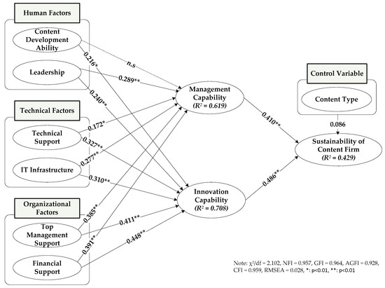 Third, the relationships between two variables (top management support and financial support) in the organizational factor and two capabilities (management and innovation) were proven to be significant. The standardized path coefficients of top management and financial support for management capability were 0.385 (t-value = 5.125) and 0.391 (t-value = 6.983), respectively. Thus, H5A and H6B were supported at p < 0.01. Moreover, top management support (β = 0.411, t-value = 7.386) and financial support (β = 0.448, t-value = 9.578) were significantly related to innovation capability, H5B and H6B were thereby supported at p < 0.01. These results show that, in content firms, the CEOs’ and executives’ full as well as financial support are essential for reinforcing managerial competence and innovation in content development. Particularly, these two variables have the greatest influence on improving management and innovation capabilities than any other variables of human and technical factors. Therefore, managerial and financial support is necessary to strengthen the managerial and innovative capacity that sustains content companies. This conclusion has also been stated in earlier studies [71].