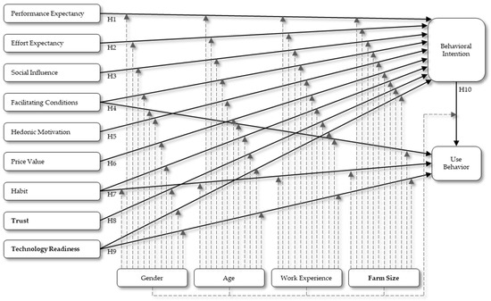 Habit is defined as the extent to which people tend to perform behaviors automatically due to learning. Habit is assumed to influence both behavioral intention and use behavior [25]. Experience must also be taken into account, since the relationship between experience and habit is formed and reinforced by repeated behavior [52]. In the context of this study, habit refers to how quickly the use of smart products becomes a routine for the farmer and proceeds as an automated behavior. Since experience is considered to be a condition for habit formation and different individuals may form different levels of habit over a period of time, experience is expected to exert a moderating effect on the relationship between habit and behavioral intention [25]. Studies showed that once older people have formed a habit through repeated use of a particular technology, it is difficult for them to override their habit to adapt to a different environment, as aging leads to a decreasing capacity to process information. [25]. In addition, men are more likely to rely on habits acquired through usage experiences to determine their behavioral intention [53]. Since farmers differ in terms of their behavior, e.g., risk perception, and habits are influenced by experience, it is assumed that farm size also has an influence on farmers’ habits [54]. The following hypotheses are set for the study: